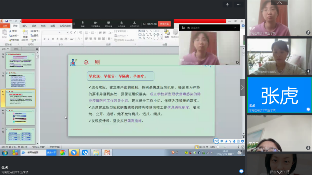 根据教务处《关于进一步加强新冠肺炎疫情防控期间网上教学工作的通知》要求,3月24日,yL23411永利官网登录召开部门工作例会,就网络教学工作、招生宣传工作和疫情防控工作召开视频会议,全体教职工参加,会议由张虎院长主持。