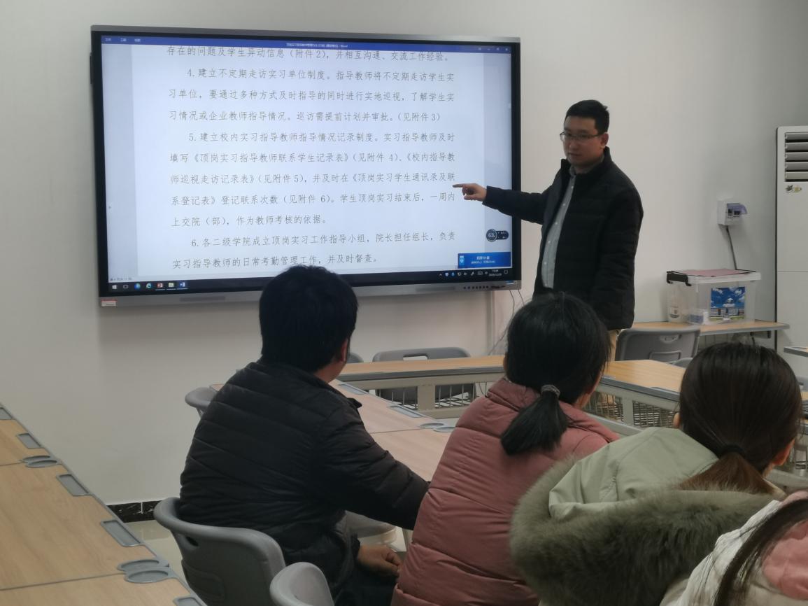 根据《教育部等五部门关于印发< 职业学校学生实习管理规定>的通知》(教职成〔2016〕3号)文件精神和《我校顶岗实习管理办法》豫应职院院字〔2017〕72号文件要求,为切实保障我院2018级顶岗实习学生工作的稳定运行。2020年12月29日下午,yL23411永利官网登录召开了2018级顶岗实习指导教师工作会议,yL23411永利官网登录副院长娄焕、教务办公室主任任旭凯及18级顶岗实习指导教师参加了本次会议。