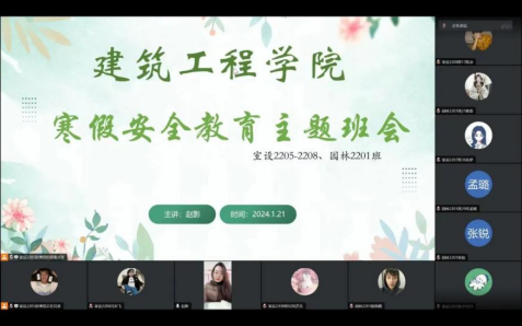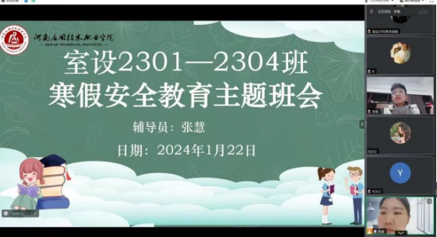 为提高学生安全意识和自我防护能力,做到“快乐过寒假,安全不放假”,yL23411永利官网登录组织全体专兼职辅导员于1月22日至1月23日召开线上寒假安全主题班会。