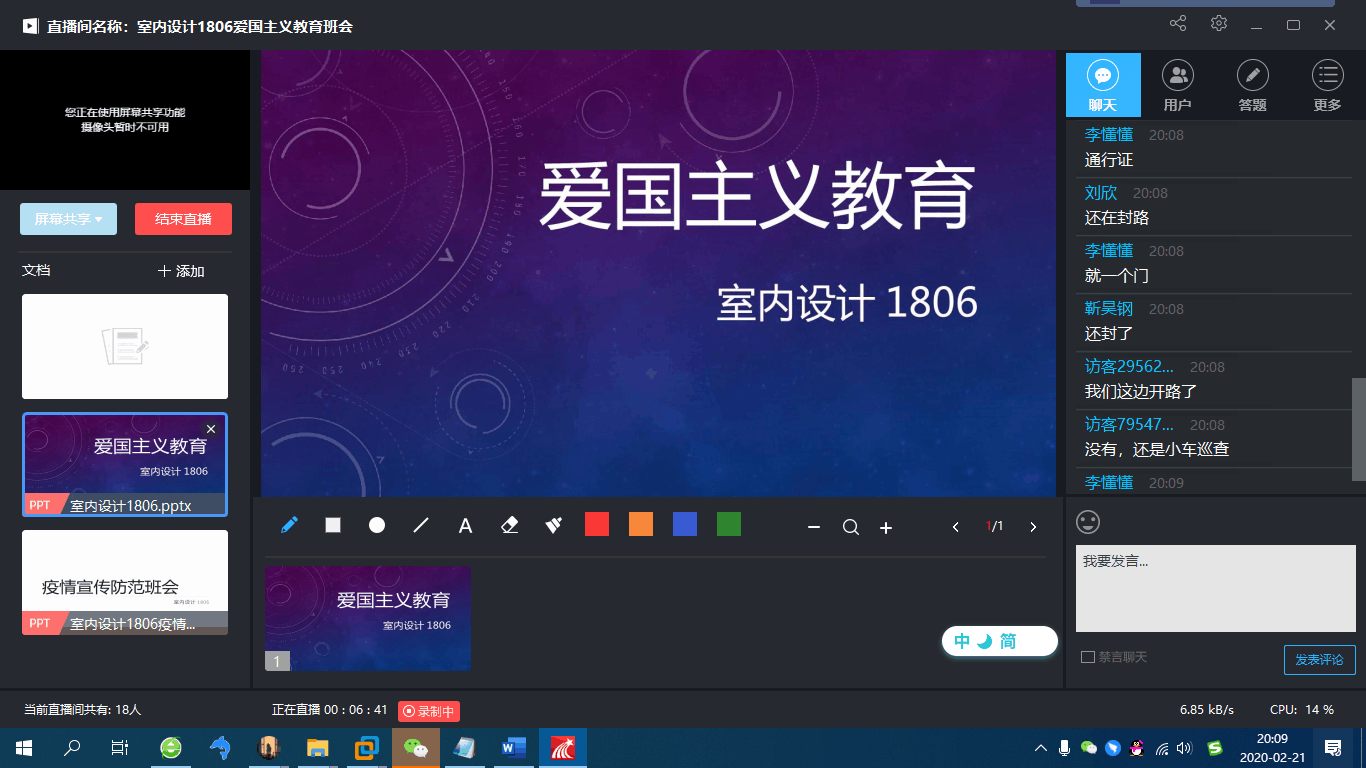 为教育广大学生提高疫情防范意识,深入贯彻落实爱国主义教育,yL23411永利官网登录于2月先后开展了“疫情就是命令,防控就是责任”以及“爱国主义教育”两次主题班会。yL23411永利官网登录42个班级共1480名学生参加,以班级为单位,由20名辅导员主持,依托QQ、企业微信、钉钉等网络方式进行宣传教育会议。