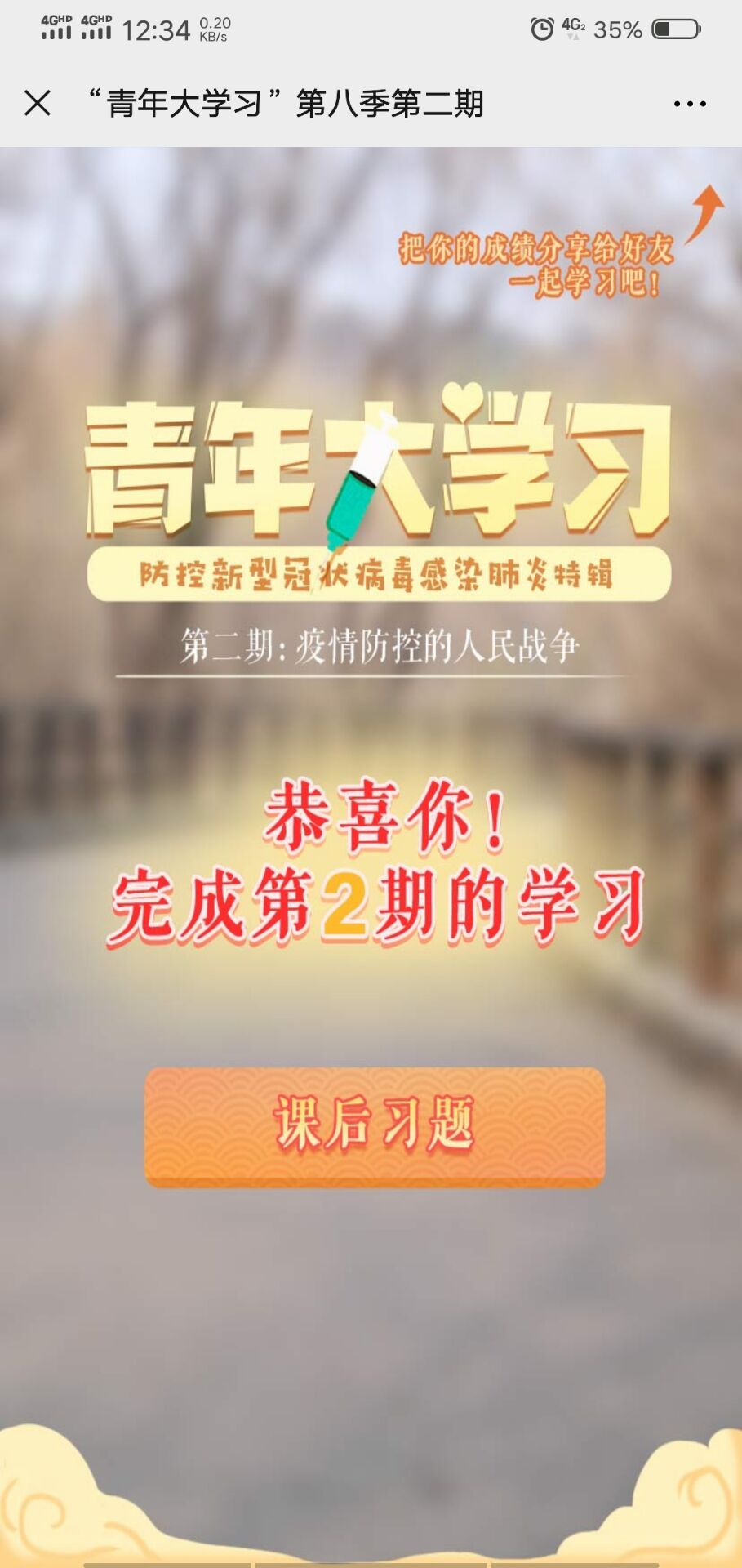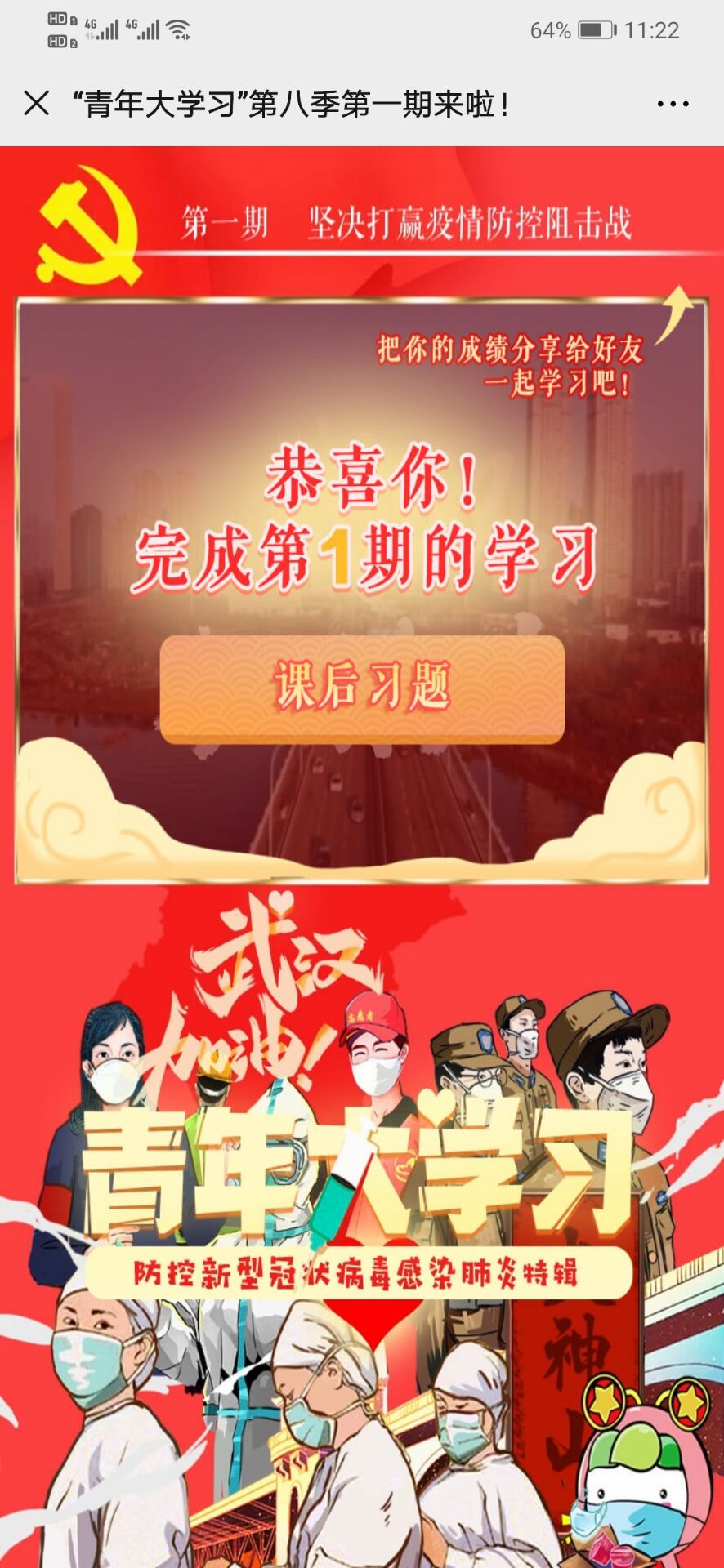 通过这两期青年大学习的学习和答题,同学们从一线的防护人员身上看到了他们敬业精神,提升了民族自信心、自豪感,深刻明白了发动群众、依靠群众巨大力量的重要性。同时作为新时代青年,同学们也将以科学防控的态度,树立万众一心、抗击疫情的信心。