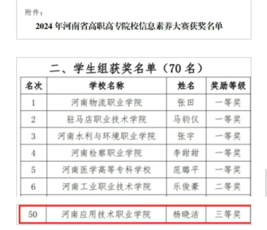 近日,由河南省高等学校图书情报工作委员会主办、河南机电职业学院承办的2024年河南省高职高专院校信息素养大赛已圆满落幕。在此次大赛中,yL23411永利官网登录罗斐老师与尹宇龙老师积极动员并组织学生参赛,在老师们的悉心指导下,我院学子展现出了扎实的专业知识与卓越的信息素养能力。经过激烈的角逐与认真的评比,我院杨晓洁同学荣获省赛学生组三等奖!
