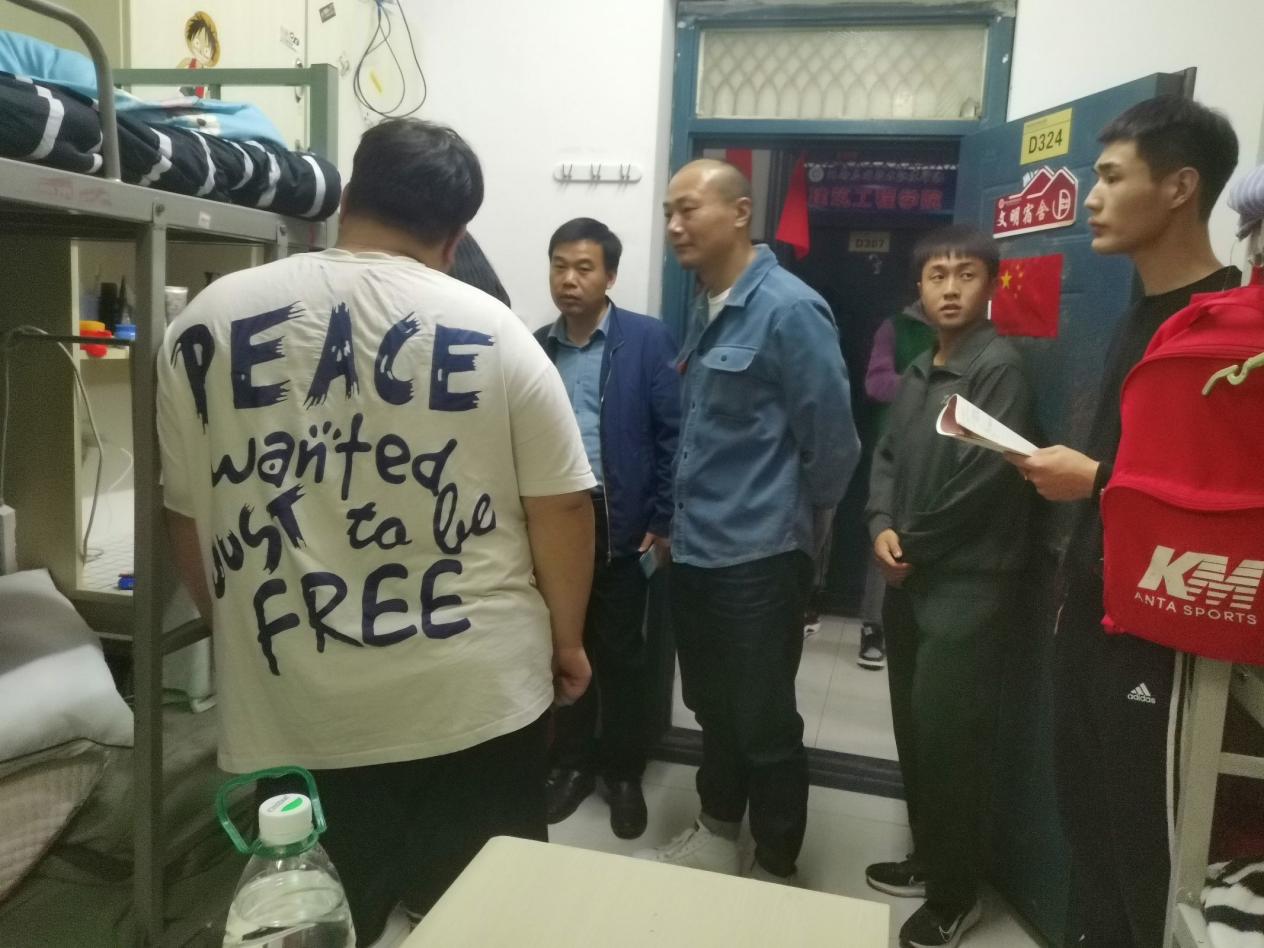 为给学生营造安全、健康的生活氛围,查找并排除同学们生活中的安全隐患,认真落实“我为群众办实事”工作。2021年11月4日,学院总支书记马春燕带领学工办主任刘高喜、辅导员丁鹏飞深入学生寝室开展安全隐患排查工作,对学院20级学生每一间宿舍的卫生、宿舍安全隐患等现象进行了检查,并与学生进行了交流,解决学生提出的相关问题。