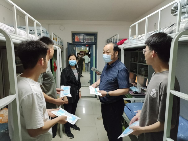 “五一”假期,郑州疫情防控升级,在校学生的疫情防控、生活食宿,时刻牵动着领导的心。2022年5月4日晚,副校长薄新党在学院党总支书记马春燕、院长张虎、副院长娄焕的陪同下,深入学生宿舍关心慰问学生,鼓励大家坚定信心,同舟共济、共克时艰。