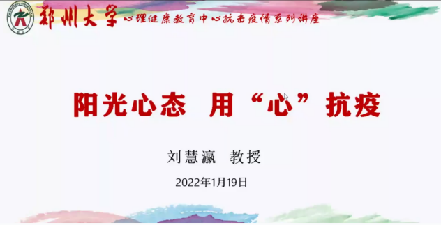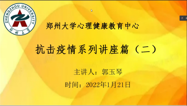 为切实做好疫情期间大学生的心理健康教育工作,进一步缓解学生心理压力,减轻心理负担,确保学生疫情期间的思想健康稳定。2022年1月19日、21日,yL23411永利官网登录组织2019级、2020级、2021级三个年级辅导员、班主任参加郑州大学心理健康教育中心举办的抗击疫情系列讲座,讲座由郑州大学心理健康教育中心副主任刘慧瀛和郑州大学心理健康教育中心督导郭玉琴讲解。