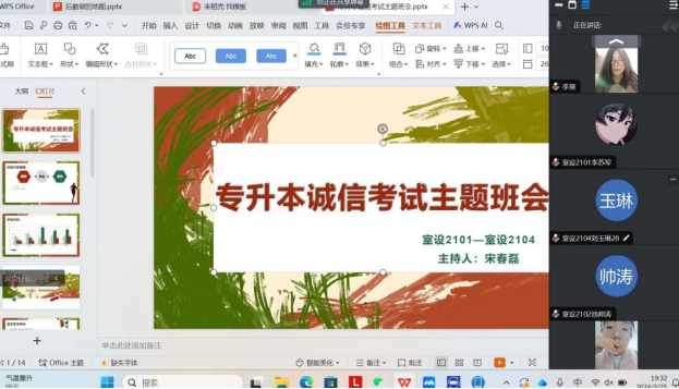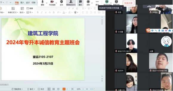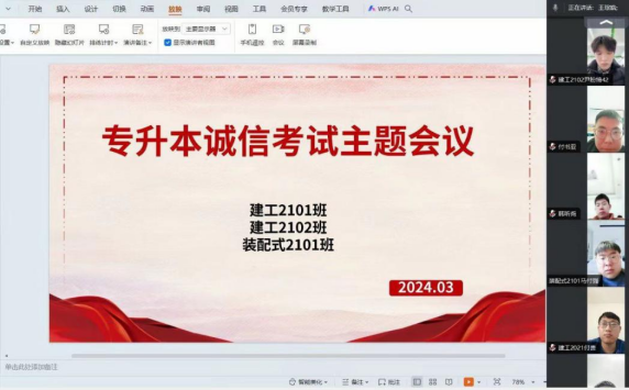 为树立学生诚信考试意识,确保2024年专升本考试安全有序、捍卫考试公平公正,进一步落实立德树人根本任务,3月18日至3月26日,yL23411永利官网登录21级各班级以线上的方式开展了2024年专升本诚信考试教育主题班会,会议由各班辅导员主持,专升本考生全部参加。